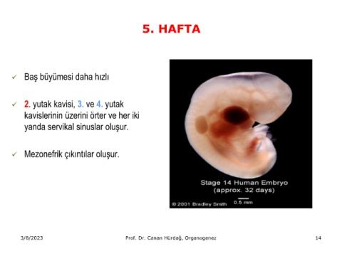 5. HAFTA ✓ Baş büyümesi daha hızlı ✓ 2. yutak kavisi, 3. ve 4. yutak kavislerinin üzerini örter ve her iki yanda servikal sinuslar oluşur. ✓ Mezonefrik çıkıntılar oluşur. 3/8/2023 Prof. Dr. Canan Hürdağ, Organogenez 14