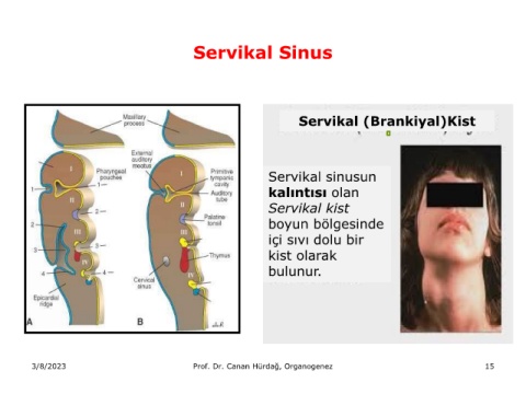 Servikal Sinus Servikal (Brankiyal)Kist Servikal sinusun kalıntısı olan Servikal kist boyun bölgesinde içi sıvı dolu bir kist olarak bulunur. 3/8/2023 Prof. Dr. Canan Hürdağ, Organogenez 15