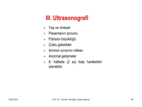 III. Ultrasonografi ➢ Yaş ve cinsiyet ➢ Plasentanın durumu ➢ Fötüsün büyüklüğü ➢ Çoklu gebelikler ➢ Amnion sıvısının miktarı ➢ Anormal gelişmeler ➢ 8. haftada (2 ay) kalp hareketleri izlenebilir. 3/8/2023 Prof. Dr. Canan Hürdağ, Organogenez 49