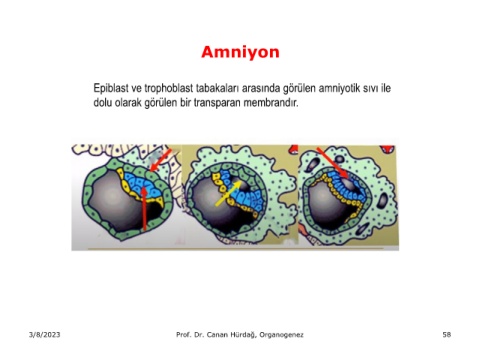 Amniyon Epiblast ve trophoblast tabakaları arasında görülen amniyotik sıvı ile dolu olarak görülen bir transparan membrandır. 3/8/2023 Prof. Dr. Canan Hürdağ, Organogenez 58