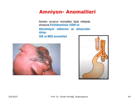 Amniyon- Anomalileri Amnion sıvısının normalden fazla miktarda olmasına Polihidraminöz >2000 ml Absorbsiyon miktarının az olmasından dolayı GIS ve MSS anomalileri 3/8/2023 Prof. Dr. Canan Hürdağ, Organogenez 64