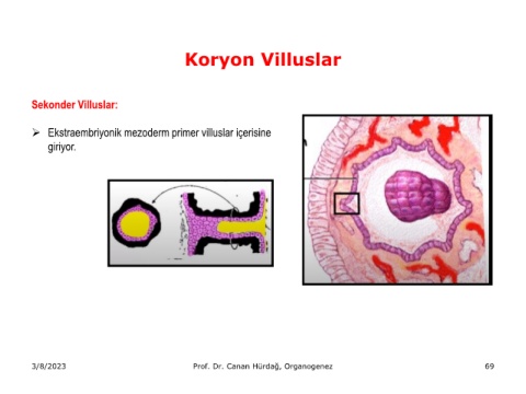 Koryon Villuslar Sekonder Villuslar: ➢ Ekstraembriyonik mezoderm primer villuslar içerisine giriyor. 3/8/2023 Prof. Dr. Canan Hürdağ, Organogenez 69