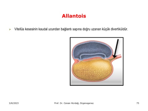 Allantois ➢ Vitellüs kesesinin kaudal ucundan bağlantı sapına doğru uzanan küçük divertiküldür. 3/8/2023 Prof. Dr. Canan Hürdağ, Organogenez 75