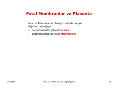 Fetal Membranlar ve Plasenta Anne ve fetus arasındaki besleyici maddeler ve gaz değişiminin yapıldığı yer. ➢ Koryon kesesinden gelişen Fetal kısım ➢ Endometriyumdan köken alan Maternal kısım 3/8/2023 Prof. Dr. Canan Hürdağ, Organogenez 91