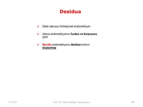 Desidua ➢ Gebe uterusun fonksiyonel endometriyum ➢ Uterus endometriyumun fundus ve korpusunu içerir ➢ Serviks endometriyumu desidua kısmını oluşturmaz 3/8/2023 Prof. Dr. Canan Hürdağ, Organogenez 93