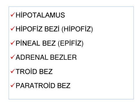 ✓HİPOTALAMUS ✓HİPOFİZ BEZİ (HİPOFİZ) ✓PİNEAL BEZ (EPİFİZ) ✓ADRENAL BEZLER ✓TROİD BEZ ✓PARATROİD BEZ