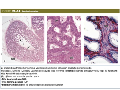 a) Düşük büyütmede her seminal vezikülün kıvrımlı bir kanaldan oluştuğu görülmektedir.