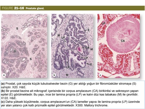 (b) Bir prostat bezine ait mikrograf; içerisinde bir corpus amylaceum (CA) birikintisi ve sekresyon yapan