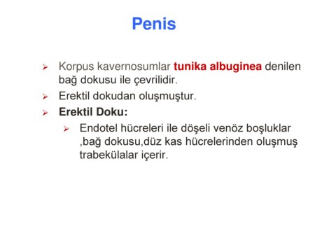 Penis ➢ Korpus kavernosumlar tunika albuginea denilen bağ dokusu ile çevrilidir. ➢ Erektil dokudan oluşmuştur. ➢ Erektil Doku: ➢ Endotel hücreleri ile döşeli venöz boşluklar ,bağ dokusu,düz kas hücrelerinden oluşmuş trabekülalar içerir.