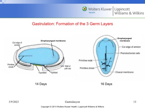 Gastrulation: Formation of the 3 Germ Layers Oropharyngeal Oropharyngeal membrane membrane 14 Days 16 Days 3/9/2023 Gastrulasyon 13 Copyright © 2013 Wolters Kluwer Health | Lippincott Williams & Wilkins