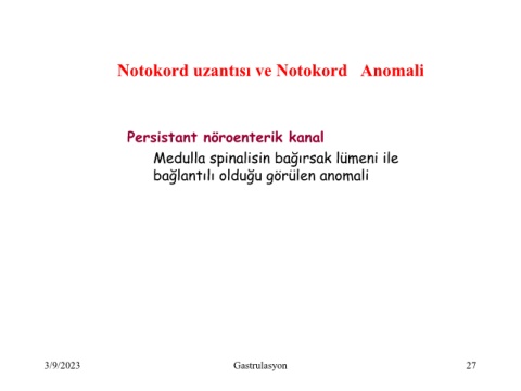 Notokord uzantısı ve Notokord Anomali Persistant nöroenterik kanal Medulla spinalisin bağırsak lümeni ile bağlantılı olduğu görülen anomali 3/9/2023 Gastrulasyon 27