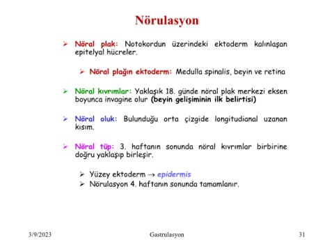 ➢ Nöral tüp: 3. haftanın sonunda nöral kıvrımlar birbirine