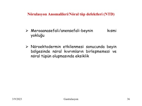 Nörulasyon Anomalileri/Nöral tüp defektleri (NTD) ➢ Meroaanasefali/anensefali-beynin kısmi yokluğu ➢ Nöroektodermin etkilenmesi sonucunda beyin bölgesinde nöral kıvrımların birleşmemesi ve nöral tüpün oluşmasında eksiklik 3/9/2023 Gastrulasyon 36