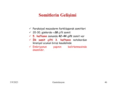 ✓ Paraksiyel mezoderm farklılaşarak somitleri