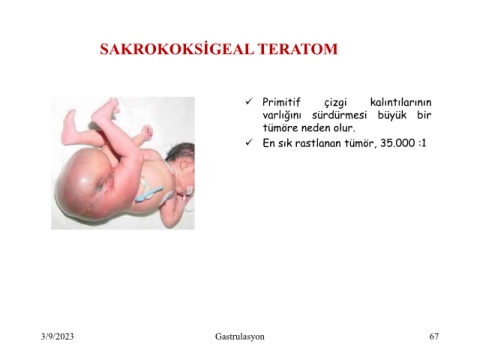 SAKROKOKSİGEAL TERATOM ✓ Primitif çizgi kalıntılarının varlığını sürdürmesi büyük bir tümöre neden olur. ✓ En sık rastlanan tümör, 35.000 :1 3/9/2023 Gastrulasyon 67