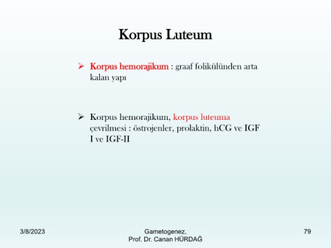Korpus Luteum ➢ Korpus hemorajikum : graaf folikülünden arta kalan yapı ➢ Korpus hemorajikum, korpus luteuma çevrilmesi : östrojenler, prolaktin, hCG ve IGF I ve IGF-II 3/8/2023 Gametogenez, 79 Prof. Dr. Canan HÜRDAĞ