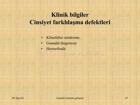 Klinik bilgiler Cinsiyet farklılaşma defektleri • Klinefelter sendromu • Gonadal disgenesiz • Hermofradit Prof. Dr. Canan HURDAG 08-Apr-20 Genital sistemin gelişimi 67