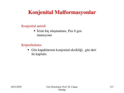 Konjenital Malformasyonlar Konjenital aniridi ▪ İrisin hiç oluşmaması, Pax 6 gen mutasyonu Kriptofitalmos ▪ Göz kapaklarının konjenital eksikliği, göz deri ile kaplıdır. 10/21/2025 Göz Histolojisi, Prof. Dr. Canan 113 Hürdağ