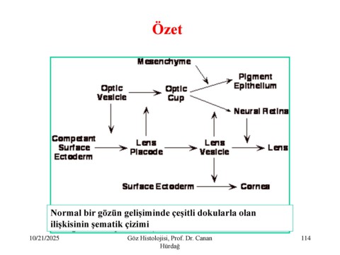 Özet Normal bir gözün gelişiminde çeşitli dokularla olan ilişkisinin şematik çizimi 10/21/2025 Göz Histolojisi, Prof. Dr. Canan 114 Hürdağ