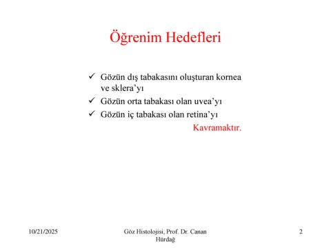 Öğrenim Hedefleri ✓ Gözün dış tabakasını oluşturan kornea ve sklera’yı ✓ Gözün orta tabakası olan uvea’yı ✓ Gözün iç tabakası olan retina’yı Kavramaktır. 10/21/2025 Göz Histolojisi, Prof. Dr. Canan 2 Hürdağ