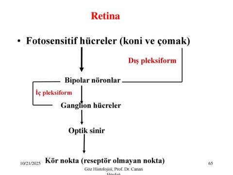 Retina • Fotosensitif hücreler (koni ve çomak) Dış pleksiform Bipolar nöronlar İç pleksiform Ganglion hücreler Optik sinir Kör nokta (reseptör olmayan nokta) 10/21/2025 65 Göz Histolojisi, Prof. Dr. Canan Hürdağ