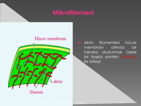 Hücre membranı Aktin filamentleri hücre membranı altında bir tabaka oluşturmak üzere bir başka protein (filamin) ile birleşir. aktin filamin Prof. Dr. Canan Hürdağ, Hücre İskeleti 20.04.2023 11
