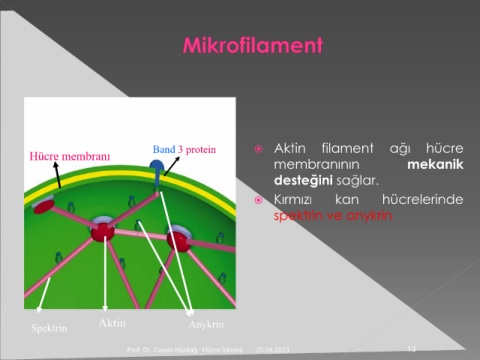 Band 3 protein Aktin filament ağı hücre Hücre membranı membranının mekanik desteğini sağlar. Kırmızı kan hücrelerinde spektrin ve anykrin Aktin Anykrin Spektrin Prof. Dr. Canan Hürdağ, Hücre İskeleti 20.04.2023 13