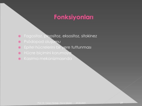 Fagositoz, pinositoz, eksositoz, sitokinez Psödopod oluşumu Epitel hücrelerini bir yere tuttunması Hücre biçimini korumaya Kasılma mekanizmasında Prof. Dr. Canan Hürdağ, Hücre İskeleti 20.04.2023 21