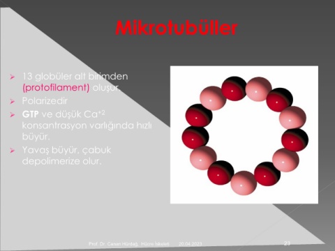 ➢ 13 globüler alt birimden (protofilament) oluşur. ➢ Polarizedir ➢ GTP ve düşük Ca +2 konsantrasyon varlığında hızlı büyür. ➢ Yavaş büyür, çabuk depolimerize olur. Prof. Dr. Canan Hürdağ, Hücre İskeleti 20.04.2023 23