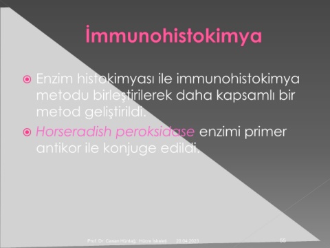 Enzim histokimyası ile immunohistokimya metodu birleştirilerek daha kapsamlı bir metod geliştirildi. Horseradish peroksidase enzimi primer antikor ile konjuge edildi. Prof. Dr. Canan Hürdağ, Hücre İskeleti 20.04.2023 55