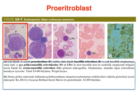 (a) Çok büyük ve seyrek proeritroblast (P), hafifçe daha küçük bazofilik eritroblast (B) ve çok bazofilik sitoplazmaya