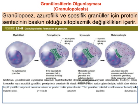 özgül granülleri miyelosit evresinde oluşur ve pembe renkte gösterilmiştir. Tüm granüller, çekirdek çentiklenmeye başladığında