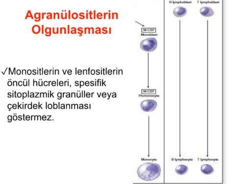 Agranülositlerin Olgunlaşması ✓Monositlerin ve lenfositlerin öncül hücreleri, spesifik sitoplazmik granüller veya çekirdek loblanması göstermez.