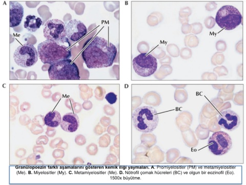 (Me). B. Miyelositler (My). C. Metamiyelositler (Me). D. Nötrofil çomak hücreleri (BC) ve olgun bir eozinofil (Eo).