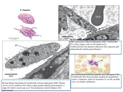 zarı ile çevrili trombosit (Pl), birkaç yoğun granül (oklarla gösterilmiştir) ve