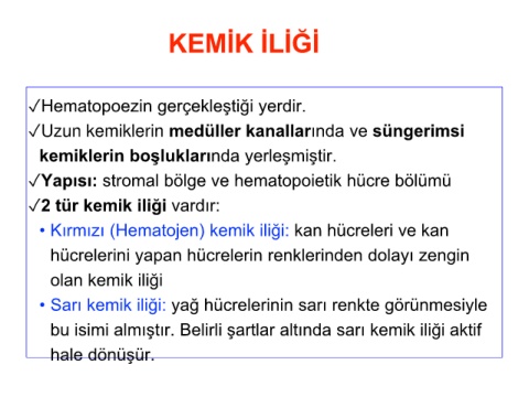 • Kırmızı (Hematojen) kemik iliği: kan hücreleri ve kan