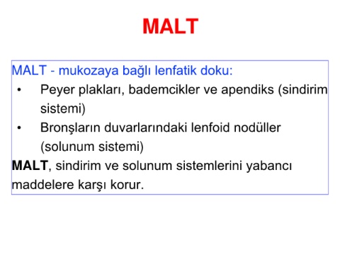 MALT MALT - mukozaya bağlı lenfatik doku: • Peyer plakları, bademcikler ve apendiks (sindirim sistemi) • Bronşların duvarlarındaki lenfoid nodüller (solunum sistemi) MALT, sindirim ve solunum sistemlerini yabancı maddelere karşı korur.