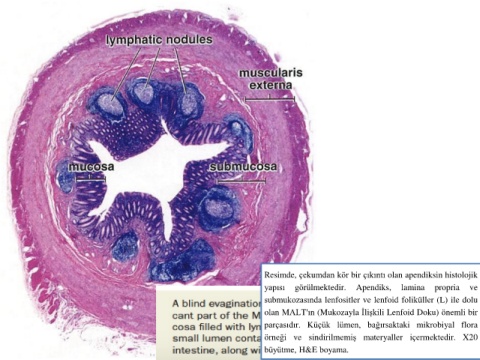 Resimde, çekumdan kör bir çıkıntı olan apendiksin histolojik