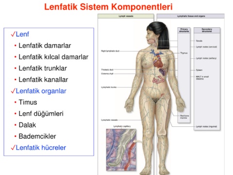Lenfatik Sistem Komponentleri ✓Lenf • Lenfatik damarlar • Lenfatik kılcal damarlar • Lenfatik trunklar • Lenfatik kanallar ✓Lenfatik organlar • Timus • Lenf düğümleri • Dalak • Bademcikler ✓Lenfatik hücreler