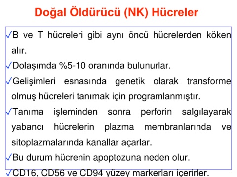 ✓CD16, CD56 ve CD94 yüzey markerları içerirler.