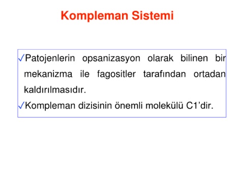 Kompleman Sistemi ✓Patojenlerin opsanizasyon olarak bilinen bir mekanizma ile fagositler tarafından ortadan kaldırılmasıdır. ✓Kompleman dizisinin önemli molekülü C1’dir.