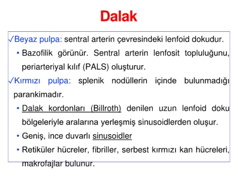 • Dalak kordonları (Billroth) denilen uzun lenfoid doku