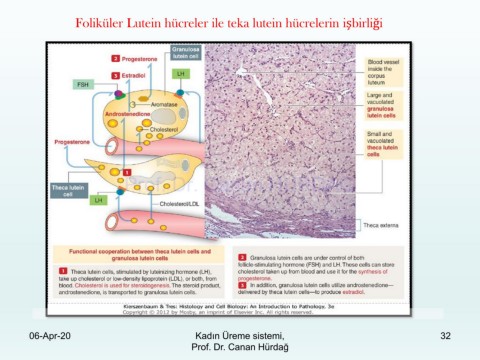 Foliküler Lutein hücreler ile teka lutein hücrelerin işbirliği Prof. Dr. Canan HURDAG 06-Apr-20 Kadın Üreme sistemi, 32 Prof. Dr. Canan Hürdağ