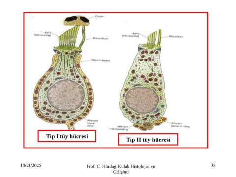 Tip I tüy hücresi Tip II tüy hücresi 10/21/2025 Prof. C. Hürdağ, Kulak Histolojisi ve 38 Gelişimi