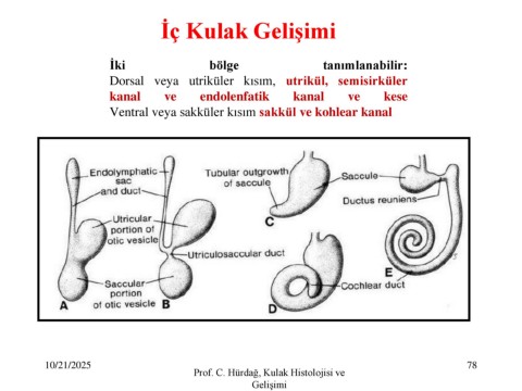 İç Kulak Gelişimi İki bölge tanımlanabilir: Dorsal veya utriküler kısım, utrikül, semisirküler kanal ve endolenfatik kanal ve kese Ventral veya sakküler kısım sakkül ve kohlear kanal 10/21/2025 78 Prof. C. Hürdağ, Kulak Histolojisi ve Gelişimi