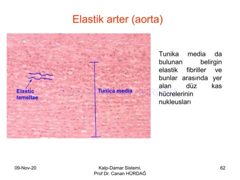 Elastik arter (aorta) Tunika media da bulunan belirgin elastik fibriller ve bunlar arasında yer alan düz kas Prof. Dr. Canan HURDAG hücrelerinin nukleusları 09-Nov-20 Kalp-Damar Sistemi, 62 Prof Dr. Canan HÜRDAĞ