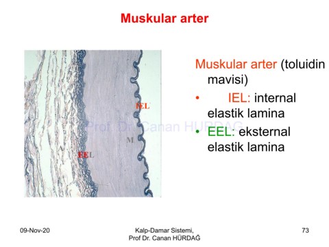 Muskular arter Muskular arter (toluidin mavisi) • IEL: internal IEL elastik lamina Prof. Dr. Canan HURDAG • EEL: eksternal M A elastik lamina EEL 09-Nov-20 Kalp-Damar Sistemi, 73 Prof Dr. Canan HÜRDAĞ