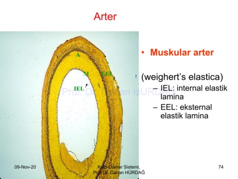 Arter • Muskular arter A M EEL (weighert’s elastica) – IEL: internal elastik IEL Prof. Dr. Canan HURDAG lamina – EEL: eksternal elastik lamina 09-Nov-20 Kalp-Damar Sistemi, 74 Prof Dr. Canan HÜRDAĞ