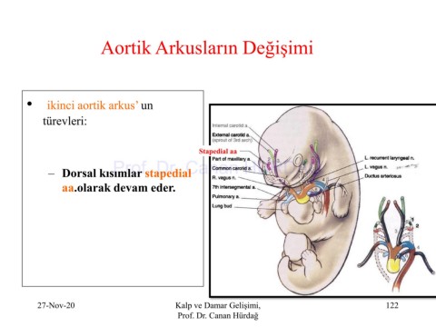 Aortik Arkusların Değişimi • ikinci aortik arkus’ un türevleri: Stapedial aa Prof. Dr. Canan HURDAG – Dorsal kısımlar stapedial aa.olarak devam eder. 27-Nov-20 Kalp ve Damar Gelişimi, 122 Prof. Dr. Canan Hürdağ