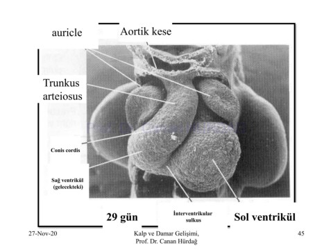 auricle Aortik kese Trunkus arteiosus Prof. Dr. Canan HURDAG Conis cordis Sağ ventrikül (gelecekteki) 29 gün İnterventrikular Sol ventrikül sulkus 27-Nov-20 Kalp ve Damar Gelişimi, 45 Prof. Dr. Canan Hürdağ